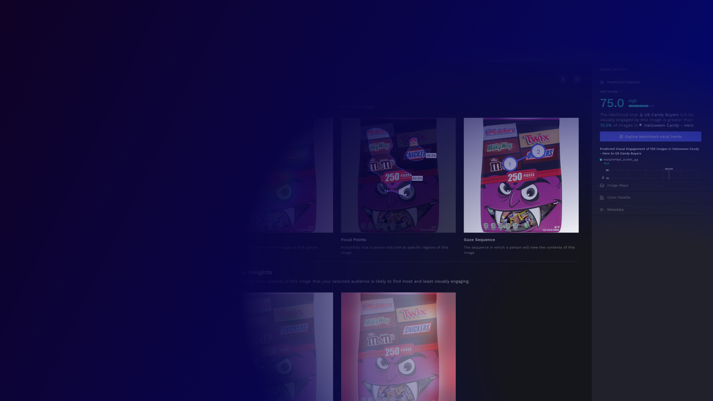 AI-powered visual appeal insights reveal specific aspects of imagery that are appealing and unappealing to a selected audience, while attention insights simulate human eye tracking and indicate where attention is likely to be garnered and how the average consumer is likely to view the elements within an image. Along with Vizit Scores, these insights are leveraged to prioritize changes that increase an image’s overall effectiveness with the intended audience.