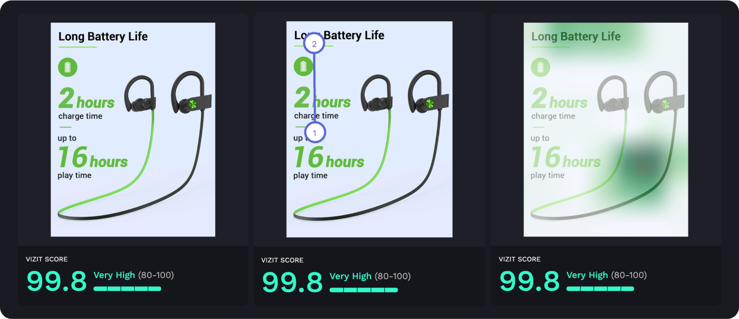 AI-powered visual appeal insights reveal specific aspects of imagery that are appealing and unappealing to a selected audience, while attention insights simulate human eye tracking and indicate where attention is likely to be garnered and how the average consumer is likely to view the elements within an image. Along with Vizit Scores, these insights are leveraged to prioritize changes that increase an image’s overall effectiveness with the intended audience.