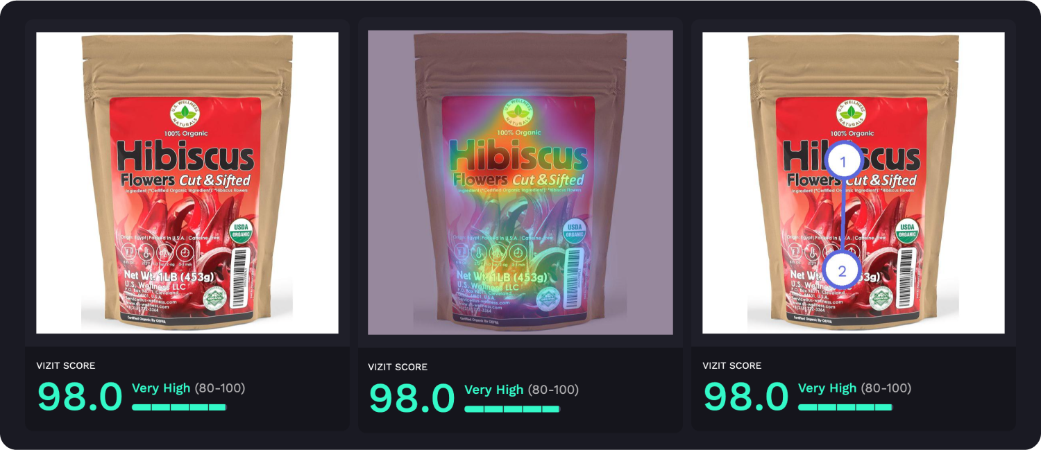 AI-powered visual appeal insights reveal specific aspects of imagery that are appealing and unappealing to a selected audience, while attention insights simulate human eye tracking and indicate where attention is likely to be garnered and how the average consumer is likely to view the elements within an image. Along with Vizit Scores, these insights are leveraged to prioritize changes that increase an image’s overall effectiveness with the intended audience.
