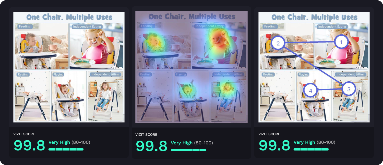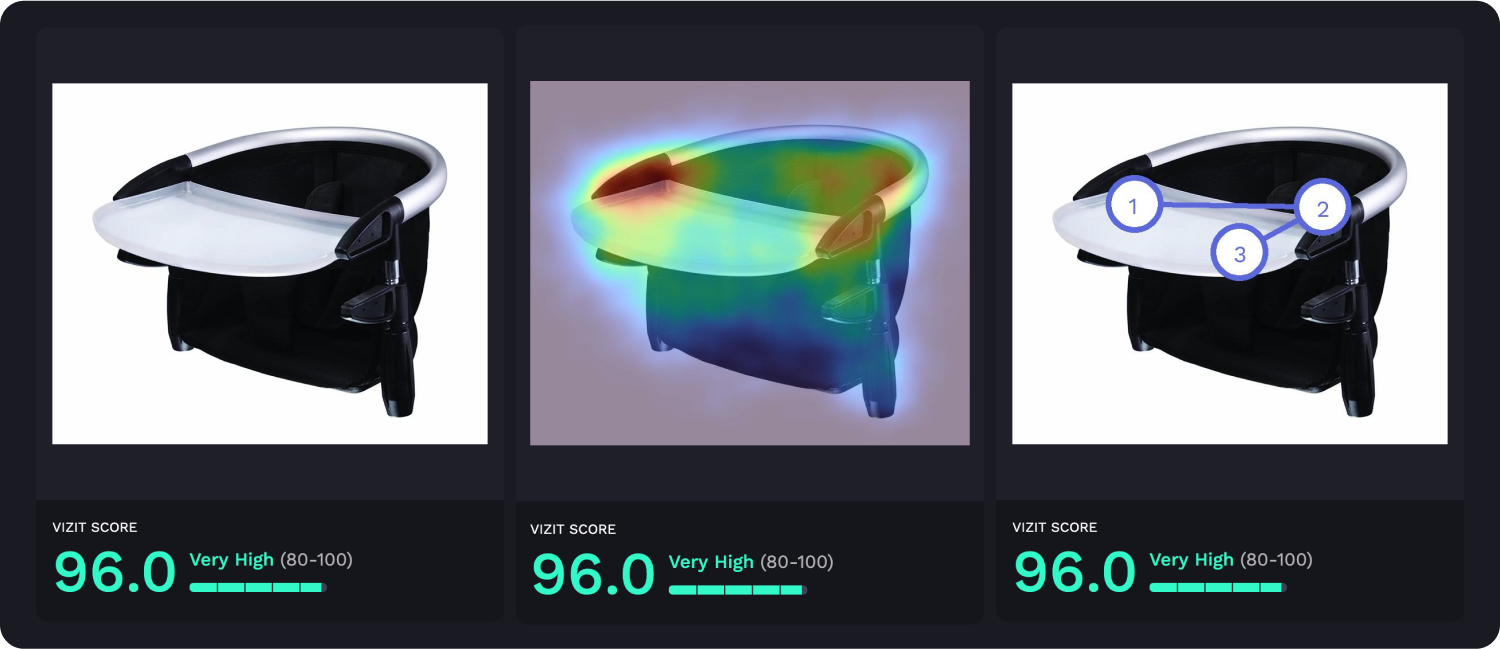 AI-powered visual appeal insights reveal specific aspects of imagery that are appealing and unappealing to a selected audience, while attention insights simulate human eye tracking and indicate where attention is likely to be garnered and how the average consumer is likely to view the elements within an image. Along with Vizit Scores, these insights are leveraged to prioritize changes that increase an image’s overall effectiveness with the intended audience.