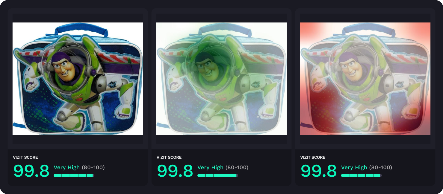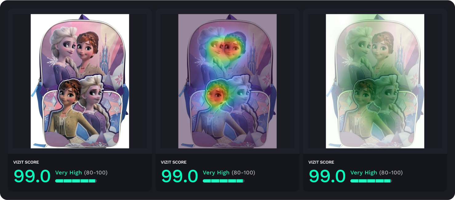 AI-powered visual appeal insights reveal specific aspects of imagery that are appealing and unappealing to a selected audience, while attention insights simulate human eye tracking and indicate where attention is likely to be garnered and how the average consumer is likely to view the elements within an image. Along with Vizit Scores, these insights are leveraged to prioritize changes that increase an image’s overall effectiveness with the intended audience.