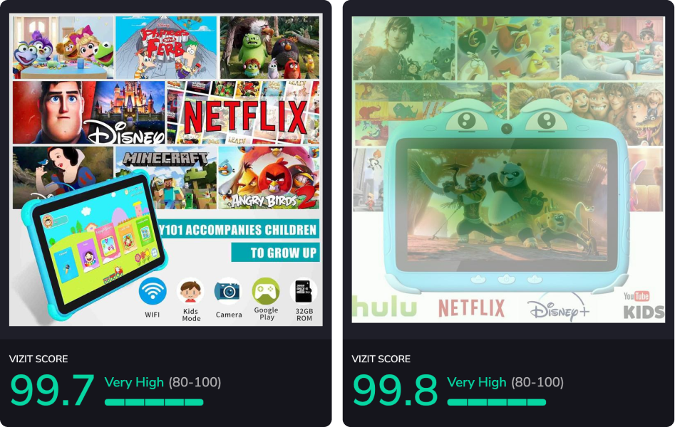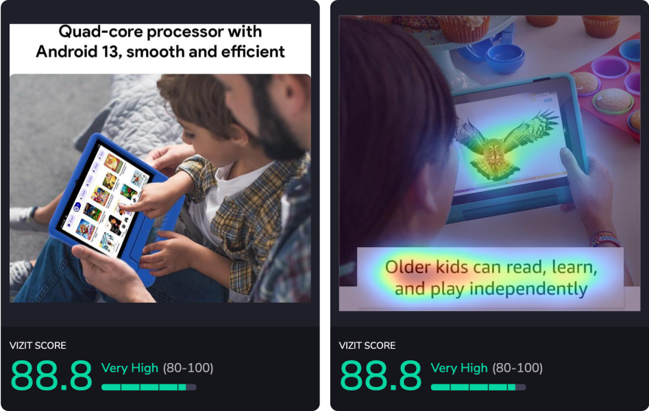 AI-powered visual appeal insights reveal specific aspects of imagery that are appealing and unappealing to a selected audience, while attention insights simulate human eye tracking and indicate where attention is likely to be garnered and how the average consumer is likely to view the elements within an image. Along with Vizit Scores, these insights are leveraged to prioritize changes that increase an image’s overall effectiveness with the intended audience.