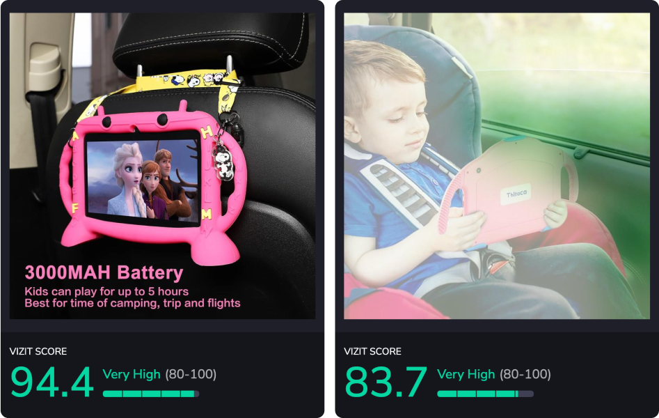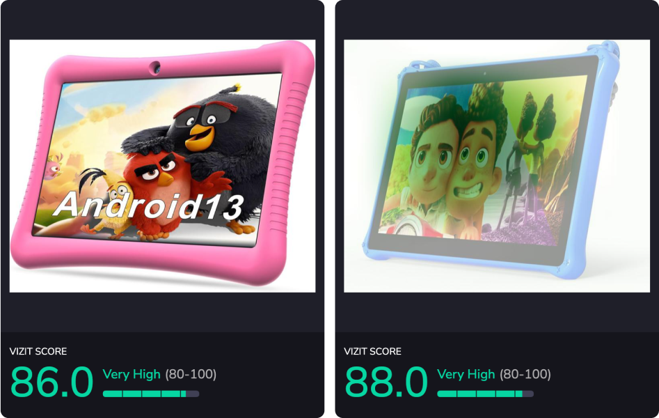 Vizit scores visual content for effectiveness with consumer audiences. Each image receives a score from 0-100 that predicts its level of effectiveness with the specified audience. Product detail page (PDP) or listing-level scores are driven by an aggregate score of the product hero or primary imagery, carousel or secondary imagery, volume of content, and sequencing of content. Content Effectiveness Rankings scores may aggregate several brand PDPs depending on retailer search and best seller lists, which fluctuate often. Higher-scoring images and PDPs are more effective and appealing to online shopper audiences.