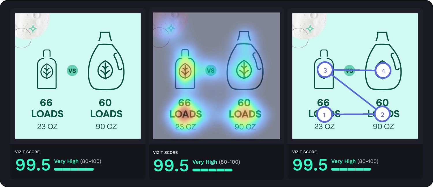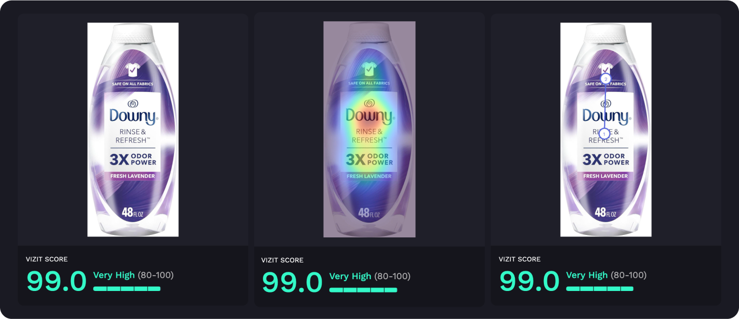 AI-powered visual appeal insights reveal specific aspects of imagery that are appealing and unappealing to a selected audience, while attention insights simulate human eye tracking and indicate where attention is likely to be garnered and how the average consumer is likely to view the elements within an image. Along with Vizit Scores, these insights are leveraged to prioritize changes that increase an image’s overall effectiveness with the intended audience.