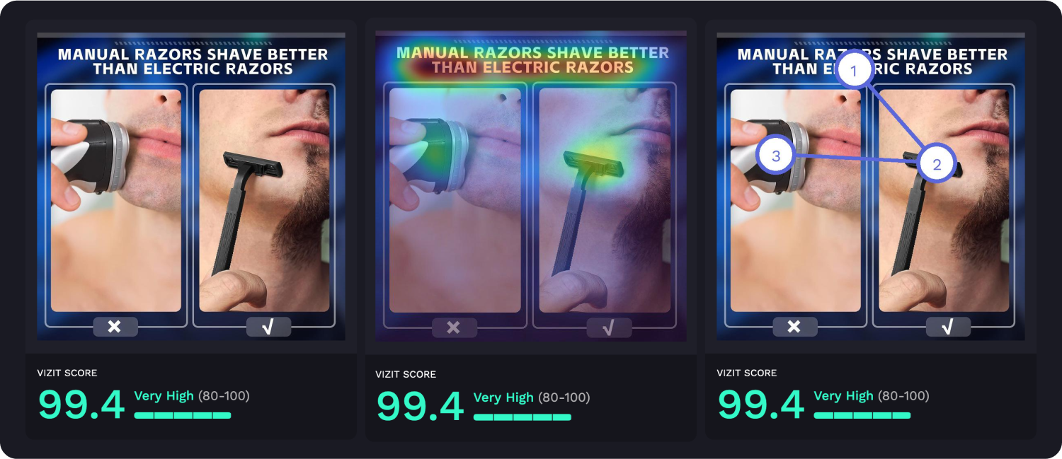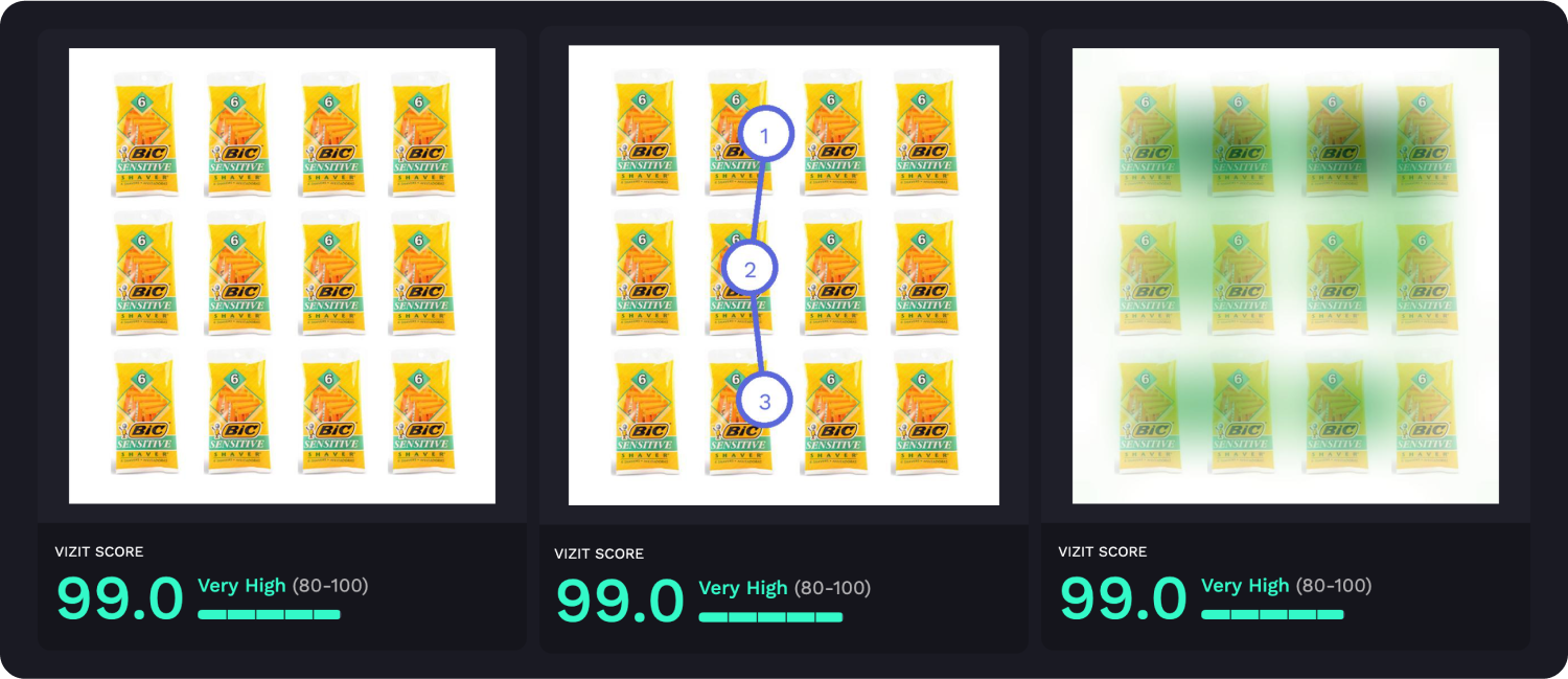AI-powered visual appeal insights reveal specific aspects of imagery that are appealing and unappealing to a selected audience, while attention insights simulate human eye tracking and indicate where attention is likely to be garnered and how the average consumer is likely to view the elements within an image. Along with Vizit Scores, these insights are leveraged to prioritize changes that increase an image’s overall effectiveness with the intended audience.