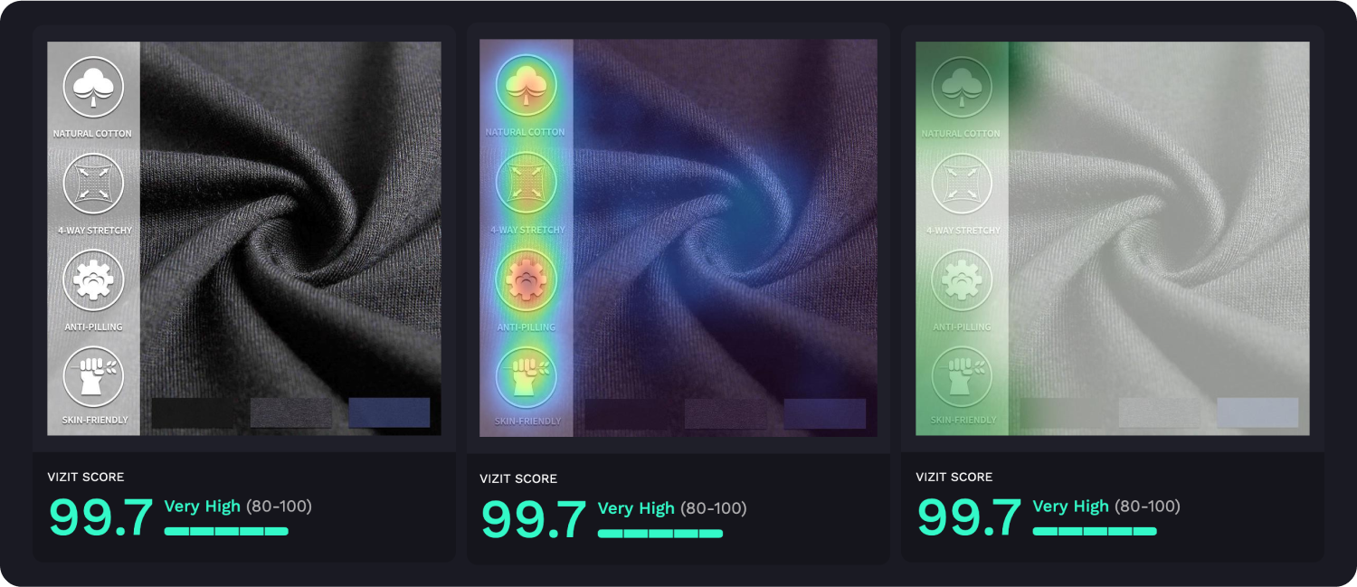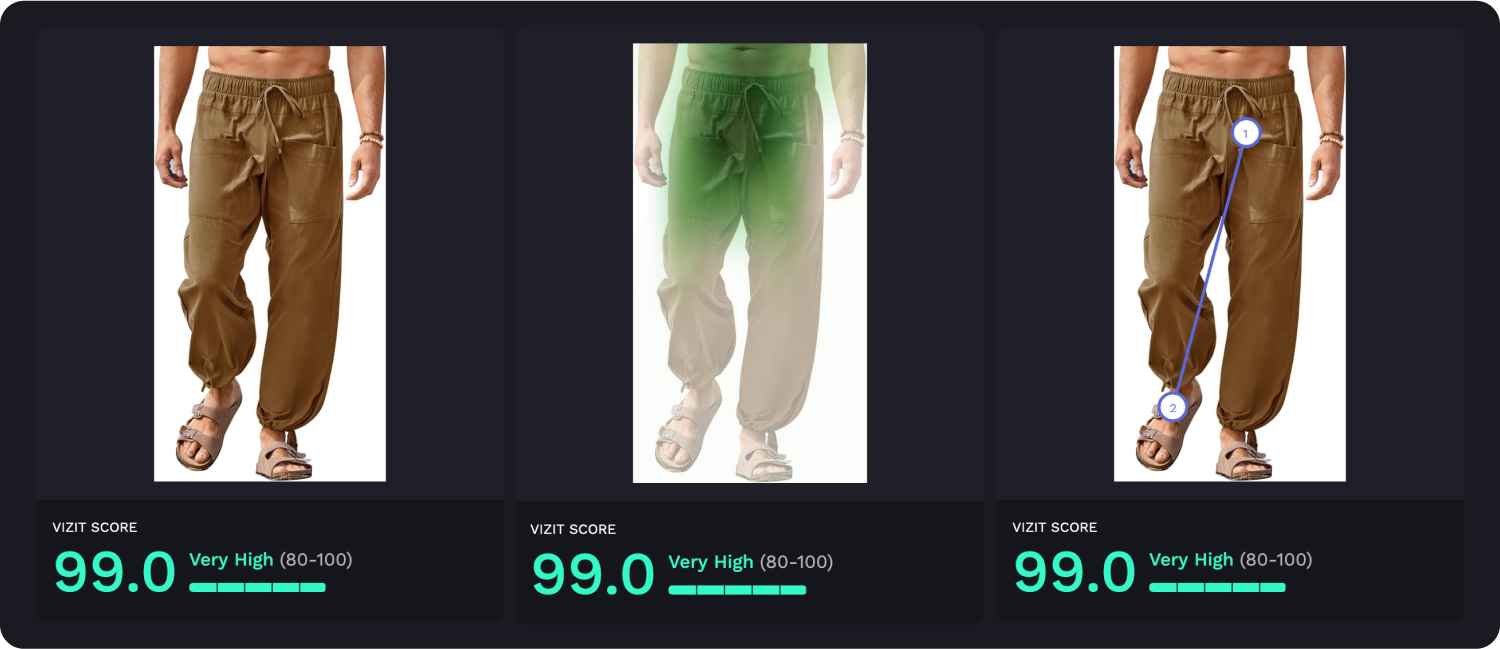 AI-powered visual appeal insights reveal specific aspects of imagery that are appealing and unappealing to a selected audience, while attention insights simulate human eye tracking and indicate where attention is likely to be garnered and how the average consumer is likely to view the elements within an image. Along with Vizit Scores, these insights are leveraged to prioritize changes that increase an image’s overall effectiveness with the intended audience.
