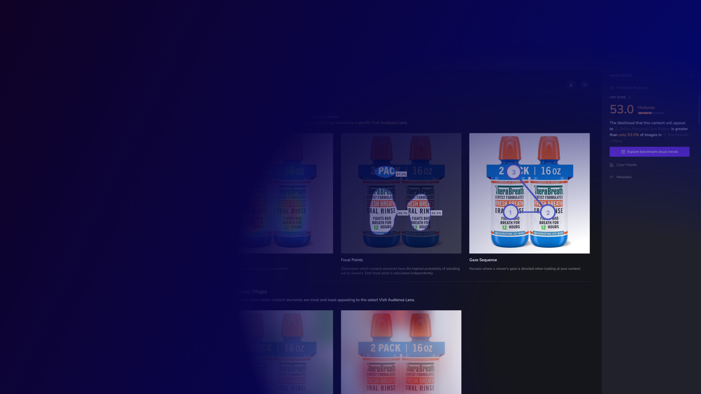 AI-powered visual appeal insights reveal specific aspects of imagery that are appealing and unappealing to a selected audience, while attention insights simulate human eye tracking and indicate where attention is likely to be garnered and how the average consumer is likely to view the elements within an image. Along with Vizit Scores, these insights are leveraged to prioritize changes that increase an image’s overall effectiveness with the intended audience.