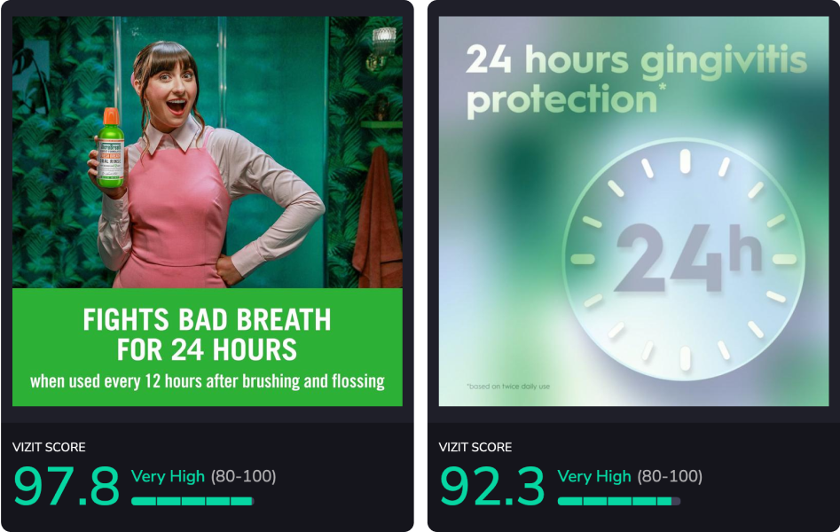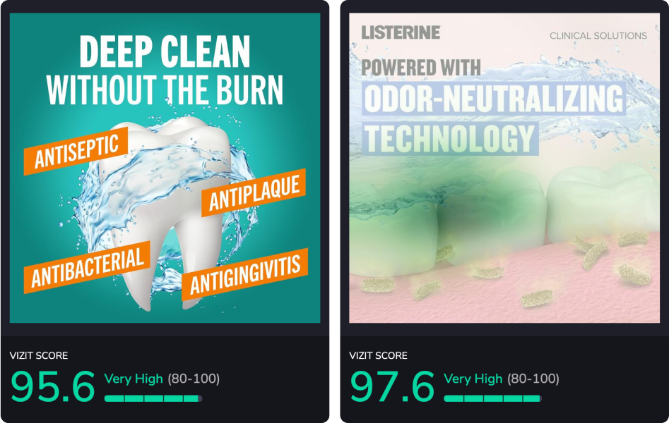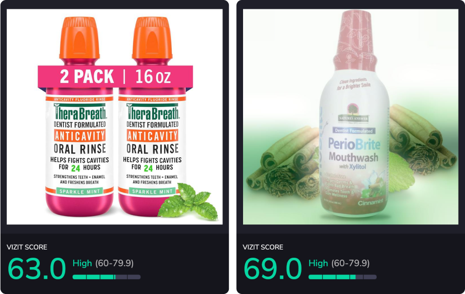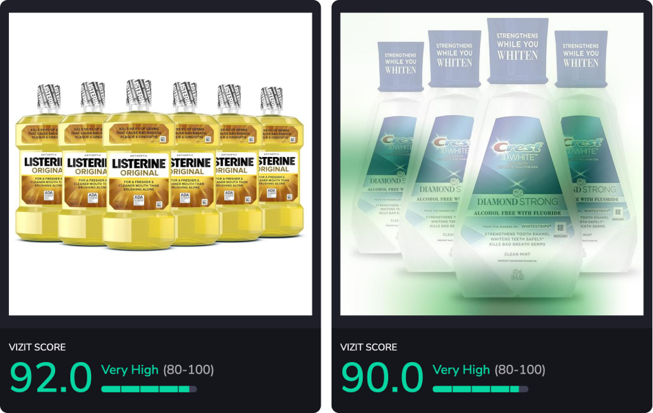 Vizit scores visual content for effectiveness with consumer audiences. Each image receives a score from 0-100 that predicts its level of effectiveness with the specified audience. Product detail page (PDP) or listing-level scores are driven by an aggregate score of the product hero or primary imagery, carousel or secondary imagery, volume of content, and sequencing of content. Content Effectiveness Rankings scores may aggregate several brand PDPs depending on retailer search and best seller lists, which fluctuate often. Higher-scoring images and PDPs are more effective and appealing to online shopper audiences.