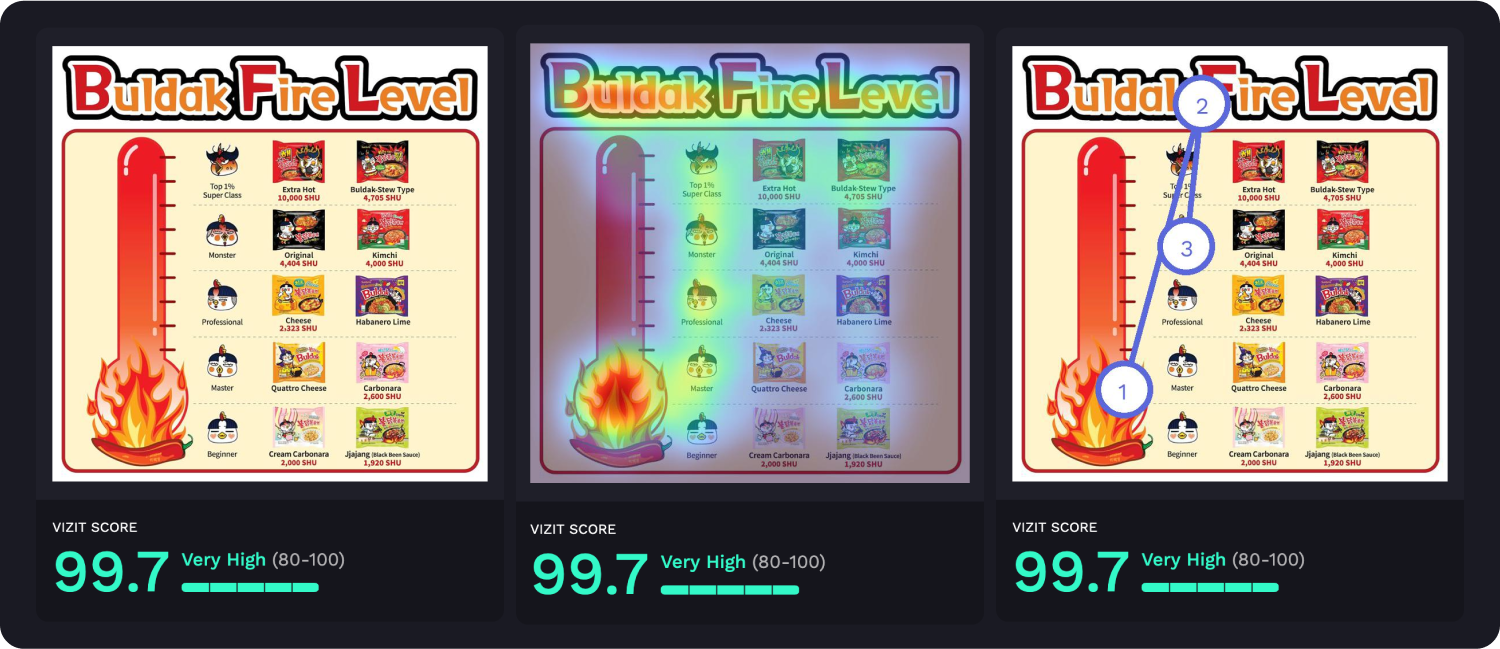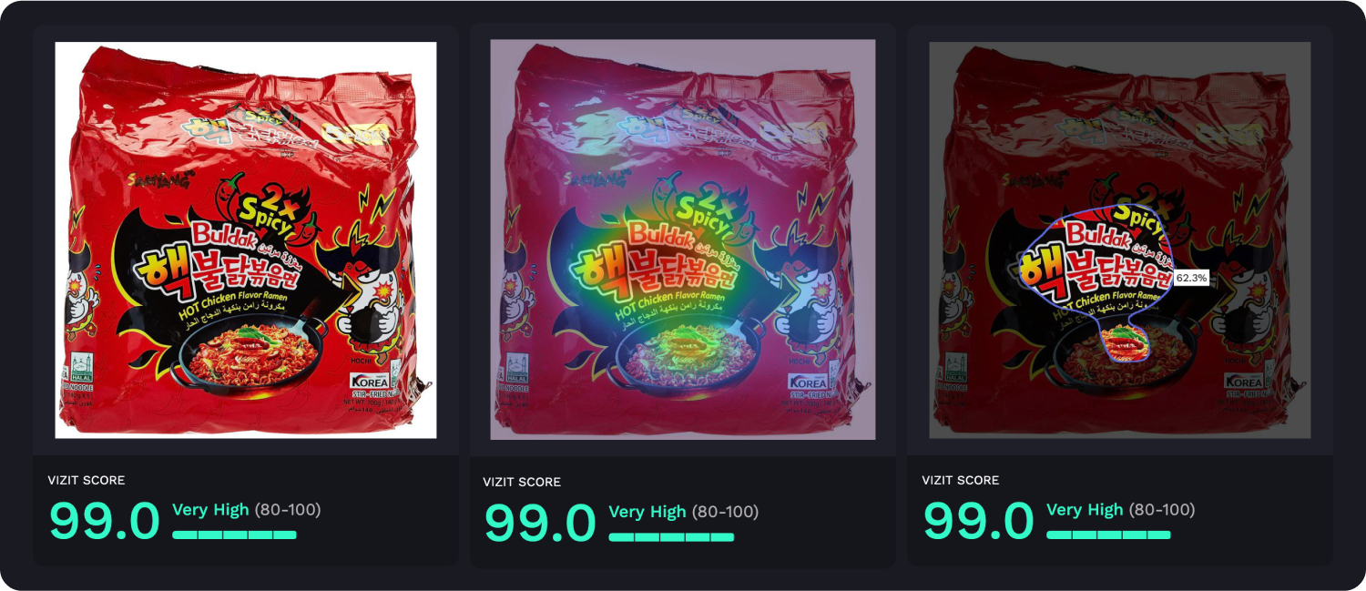 AI-powered visual appeal insights reveal specific aspects of imagery that are appealing and unappealing to a selected audience, while attention insights simulate human eye tracking and indicate where attention is likely to be garnered and how the average consumer is likely to view the elements within an image. Along with Vizit Scores, these insights are leveraged to prioritize changes that increase an image’s overall effectiveness with the intended audience.