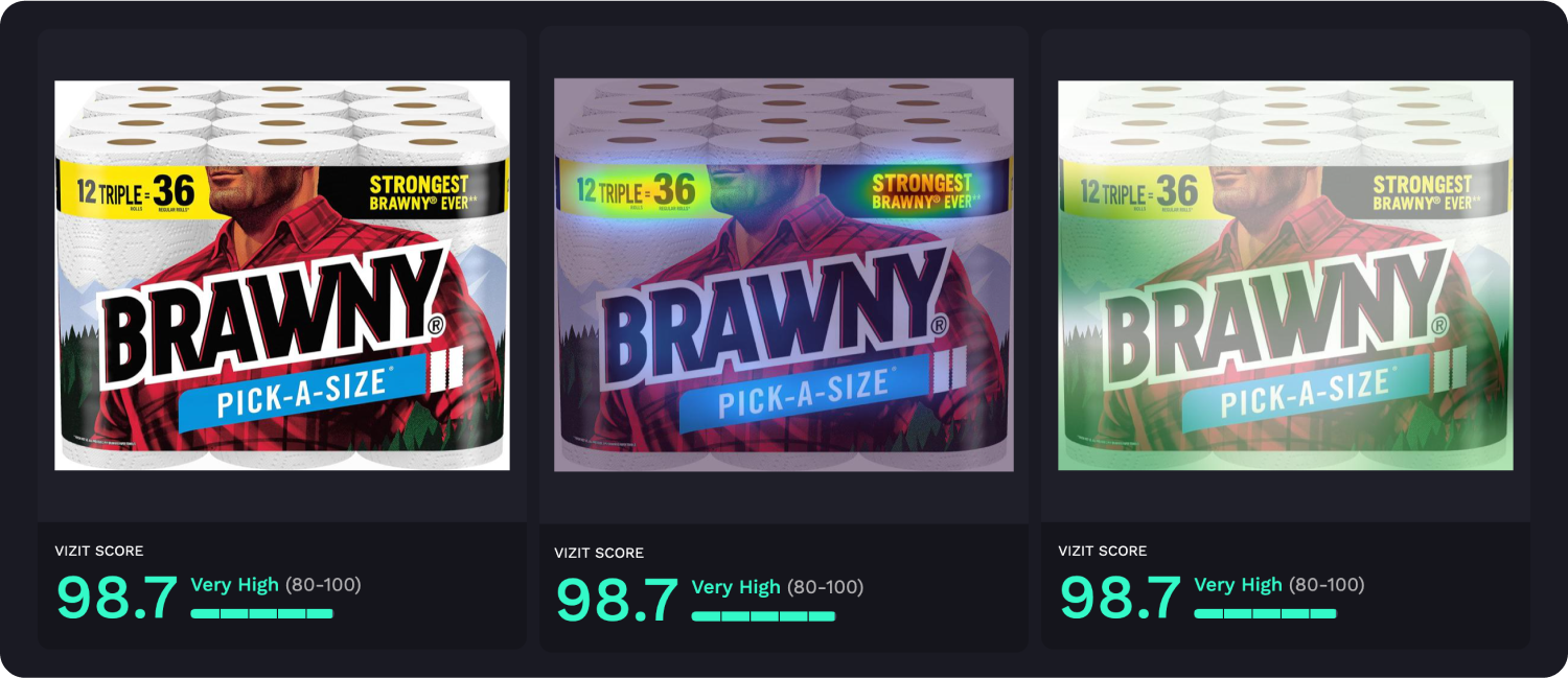 AI-powered visual appeal insights reveal specific aspects of imagery that are appealing and unappealing to a selected audience, while attention insights simulate human eye tracking and indicate where attention is likely to be garnered and how the average consumer is likely to view the elements within an image. Along with Vizit Scores, these insights are leveraged to prioritize changes that increase an image’s overall effectiveness with the intended audience.