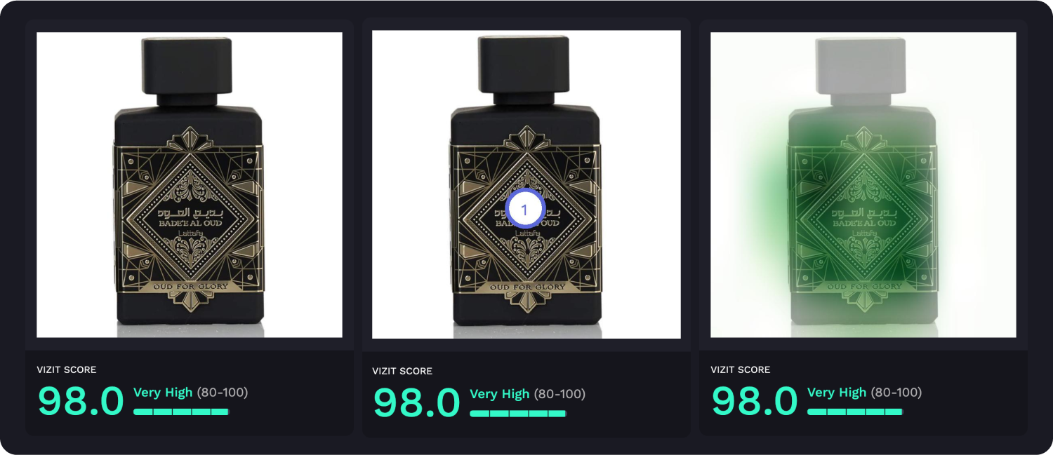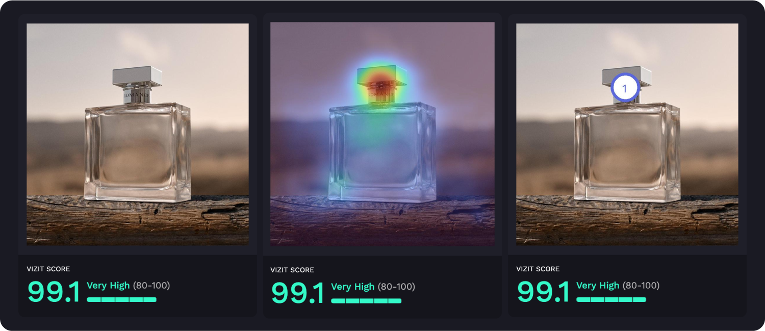 AI-powered visual appeal insights reveal specific aspects of imagery that are appealing and unappealing to a selected audience, while attention insights simulate human eye tracking and indicate where attention is likely to be garnered and how the average consumer is likely to view the elements within an image. Along with Vizit Scores, these insights are leveraged to prioritize changes that increase an image’s overall effectiveness with the intended audience.