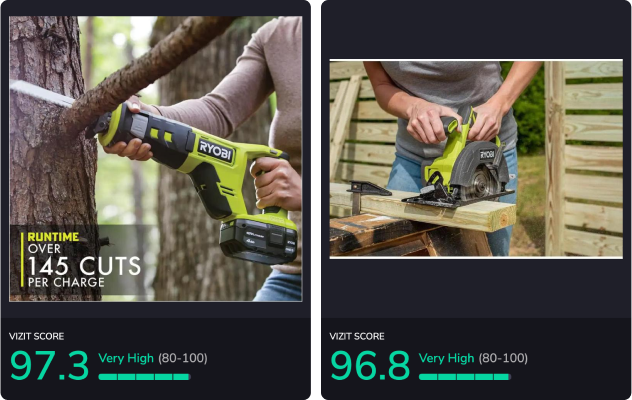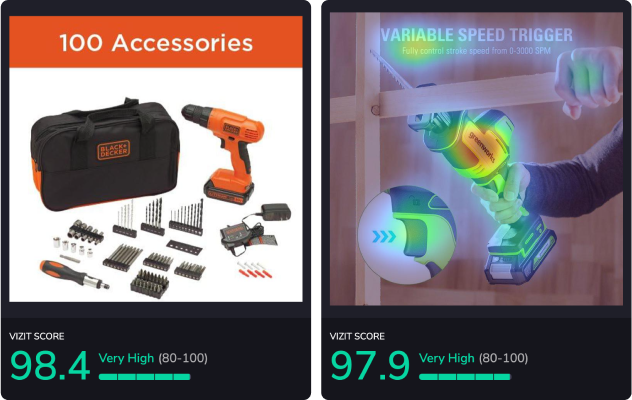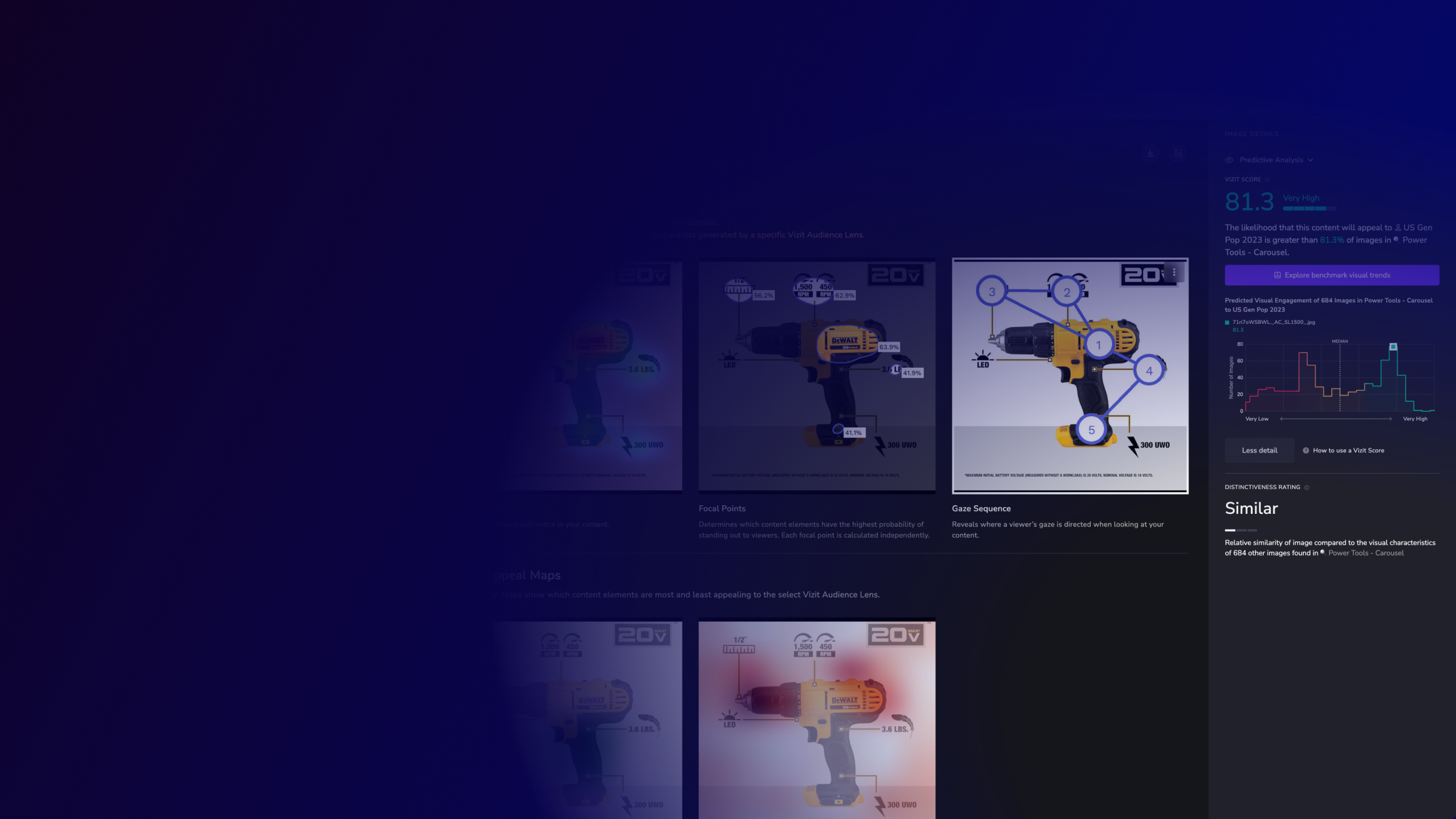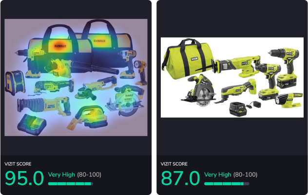 AI-powered visual appeal insights reveal specific aspects of imagery that are appealing and unappealing to a selected audience, while attention insights simulate human eye tracking and indicate where attention is likely to be garnered and how the average consumer is likely to view the elements within an image. Along with Vizit Scores, these insights are leveraged to prioritize changes that increase an image’s overall effectiveness with the intended audience.
