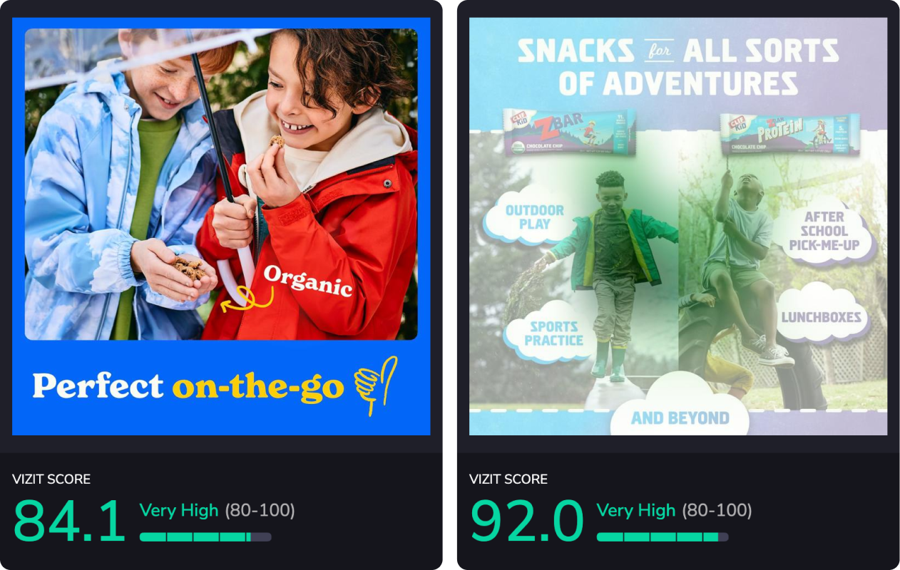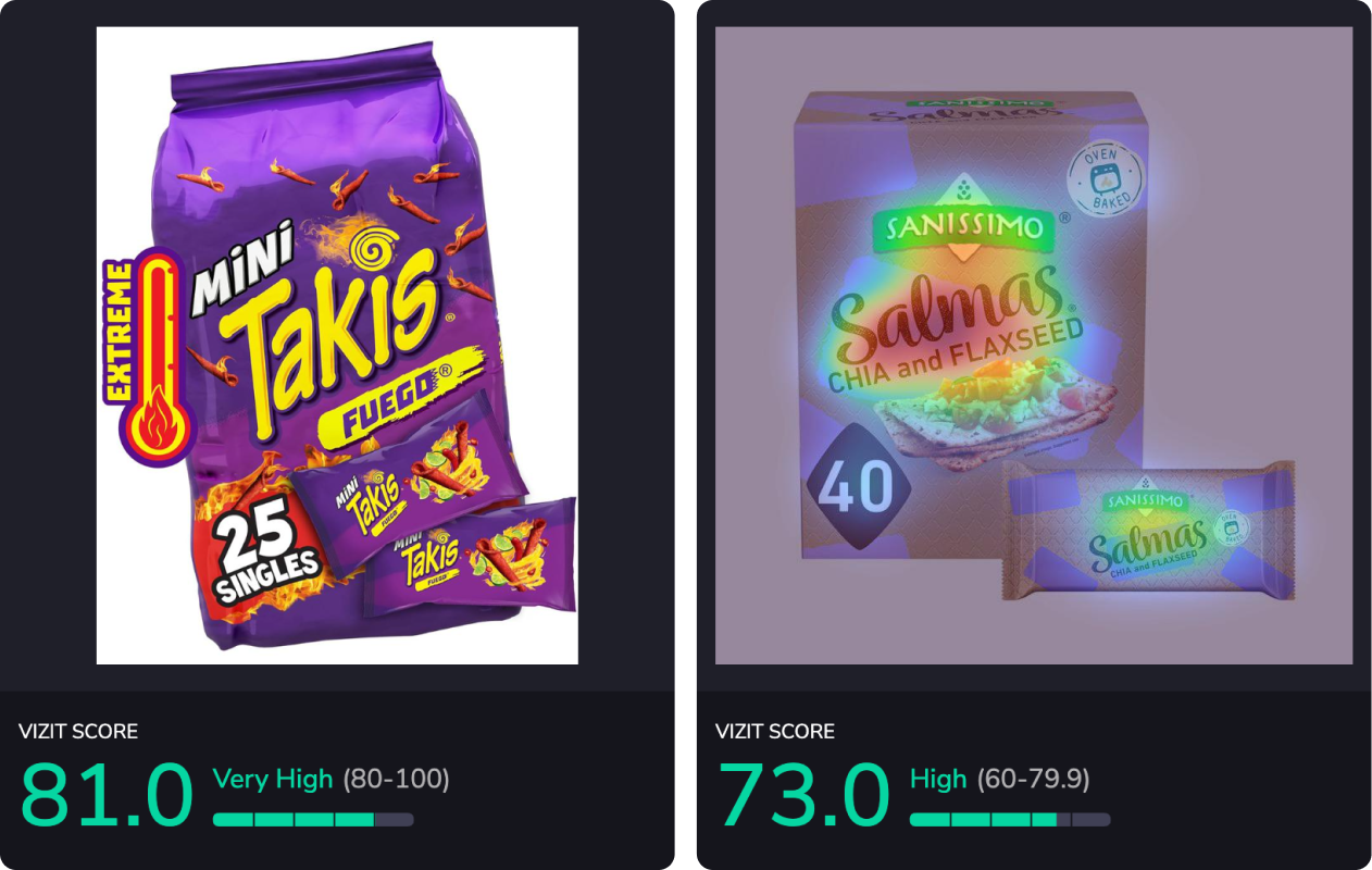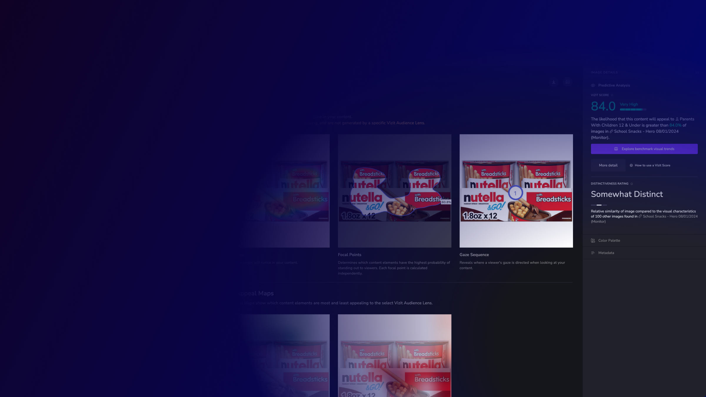 AI-powered visual appeal insights reveal specific aspects of imagery that are appealing and unappealing to a selected audience, while attention insights simulate human eye tracking and indicate where attention is likely to be garnered and how the average consumer is likely to view the elements within an image. Along with Vizit Scores, these insights are leveraged to prioritize changes that increase an image’s overall effectiveness with the intended audience.