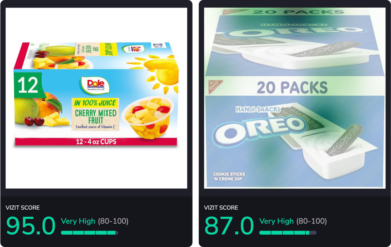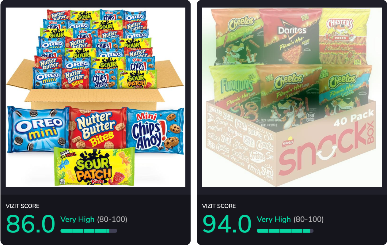 Vizit scores visual content for effectiveness with consumer audiences. Each image receives a score from 0-100 that predicts its level of effectiveness with the specified audience. Product detail page (PDP) or listing-level scores are driven by an aggregate score of the product hero or primary imagery, carousel or secondary imagery, volume of content, and sequencing of content. Content Effectiveness Rankings scores may aggregate several brand PDPs depending on retailer search and best seller lists, which fluctuate often. Higher-scoring images and PDPs are more effective and appealing to online shopper audiences.