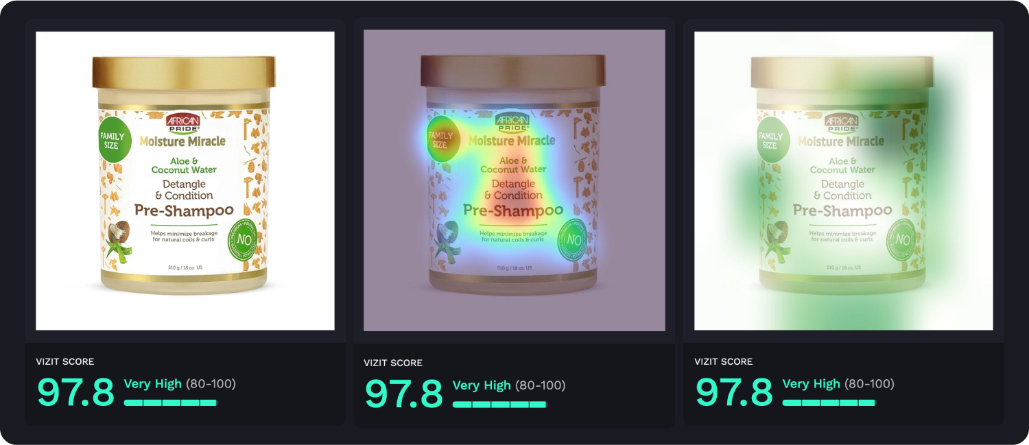 AI-powered visual appeal insights reveal specific aspects of imagery that are appealing and unappealing to a selected audience, while attention insights simulate human eye tracking and indicate where attention is likely to be garnered and how the average consumer is likely to view the elements within an image. Along with Vizit Scores, these insights are leveraged to prioritize changes that increase an image’s overall effectiveness with the intended audience.
