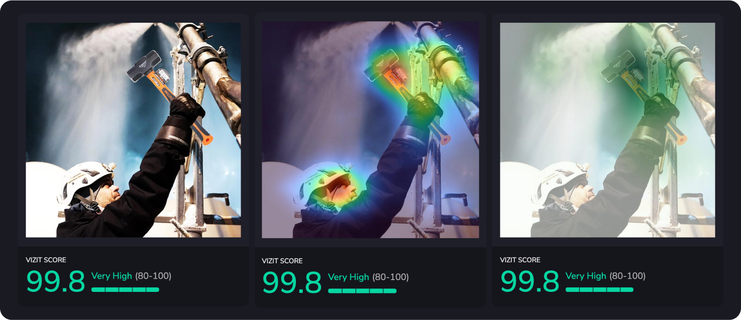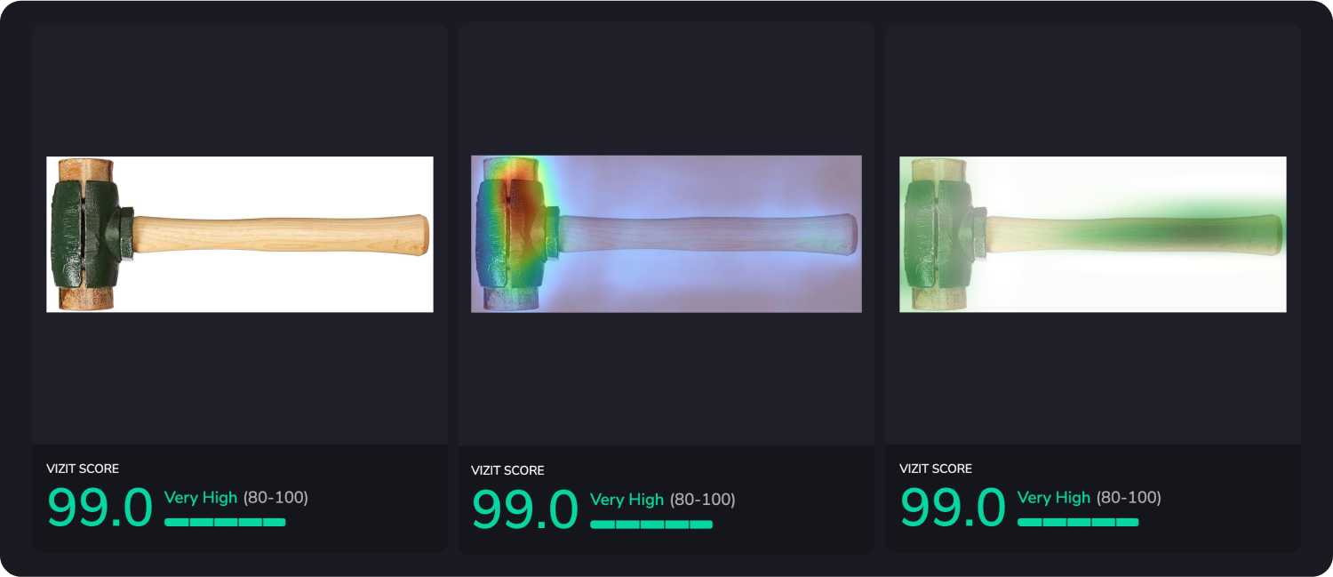 AI-powered visual appeal insights reveal specific aspects of imagery that are appealing and unappealing to a selected audience, while attention insights simulate human eye tracking and indicate where attention is likely to be garnered and how the average consumer is likely to view the elements within an image. Along with Vizit Scores, these insights are leveraged to prioritize changes that increase an image’s overall effectiveness with the intended audience.