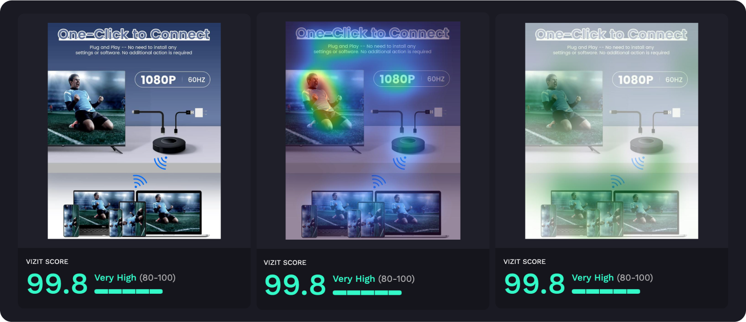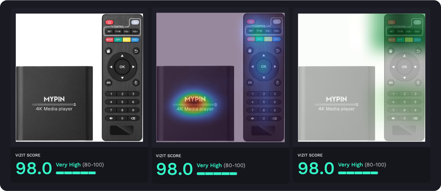 AI-powered visual appeal insights reveal specific aspects of imagery that are appealing and unappealing to a selected audience, while attention insights simulate human eye tracking and indicate where attention is likely to be garnered and how the average consumer is likely to view the elements within an image. Along with Vizit Scores, these insights are leveraged to prioritize changes that increase an image’s overall effectiveness with the intended audience.
