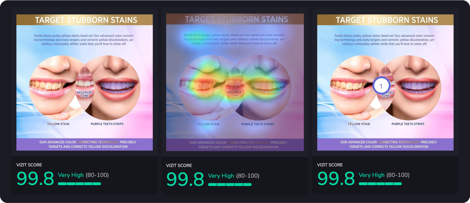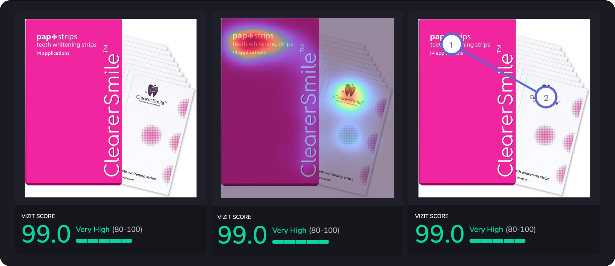 AI-powered visual appeal insights reveal specific aspects of imagery that are appealing and unappealing to a selected audience, while attention insights simulate human eye tracking and indicate where attention is likely to be garnered and how the average consumer is likely to view the elements within an image. Along with Vizit Scores, these insights are leveraged to prioritize changes that increase an image’s overall effectiveness with the intended audience.