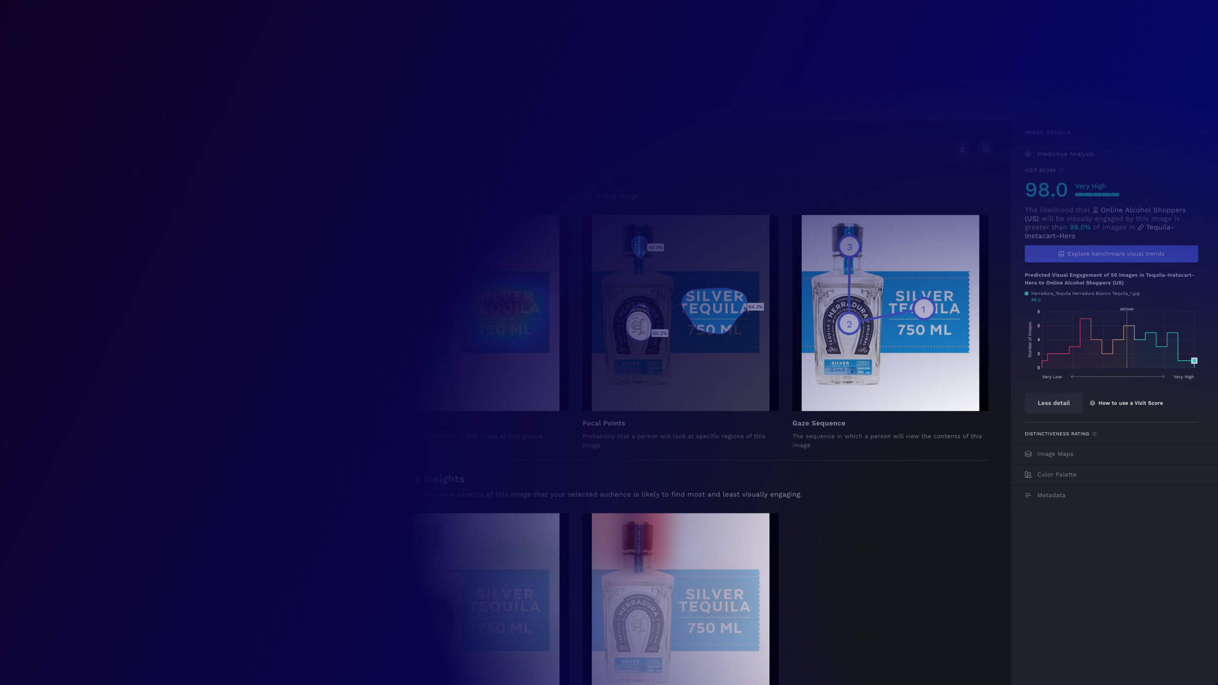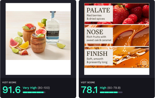 AI-powered visual appeal insights reveal specific aspects of imagery that are appealing and unappealing to a selected audience, while attention insights simulate human eye tracking and indicate where attention is likely to be garnered and how the average consumer is likely to view the elements within an image. Along with Vizit Scores, these insights are leveraged to prioritize changes that increase an image’s overall effectiveness with the intended audience.