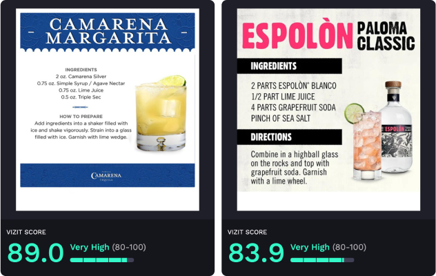Vizit scores visual content for effectiveness with consumer audiences. Each image receives a score from 0-100 that predicts its level of effectiveness with the specified audience. Product detail page (PDP) or listing-level scores are driven by an aggregate score of the product hero or primary imagery, carousel or secondary imagery, volume of content, and sequencing of content. Content Effectiveness Rankings scores may aggregate several brand PDPs depending on retailer search and best seller lists, which fluctuate often. Higher-scoring images and PDPs are more effective and appealing to online shopper audiences.