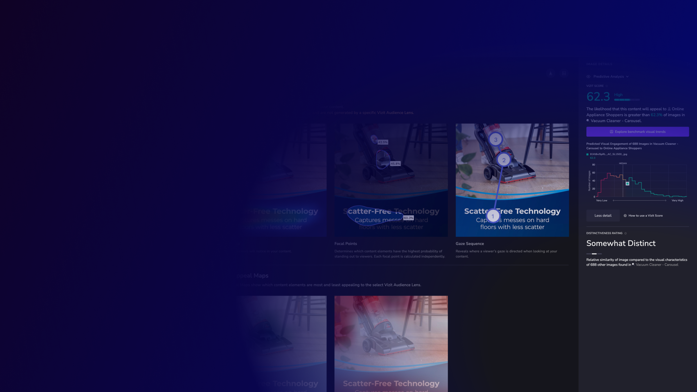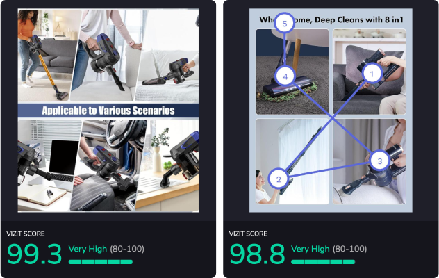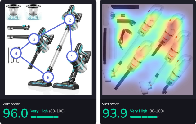 AI-powered visual appeal insights reveal specific aspects of imagery that are appealing and unappealing to a selected audience, while attention insights simulate human eye tracking and indicate where attention is likely to be garnered and how the average consumer is likely to view the elements within an image. Along with Vizit Scores, these insights are leveraged to prioritize changes that increase an image’s overall effectiveness with the intended audience.