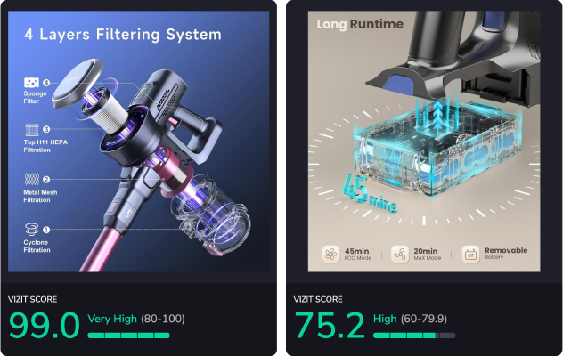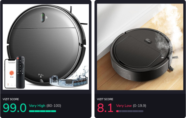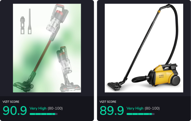 Vizit scores visual content for effectiveness with consumer audiences. Each image receives a score from 0-100 that predicts its level of effectiveness with the specified audience. Product detail page (PDP) or listing-level scores are driven by an aggregate score of the product hero or primary imagery, carousel or secondary imagery, volume of content, and sequencing of content. Content Effectiveness Rankings scores may aggregate several brand PDPs depending on retailer search and best seller lists, which fluctuate often. Higher-scoring images and PDPs are more effective and appealing to online shopper audiences.