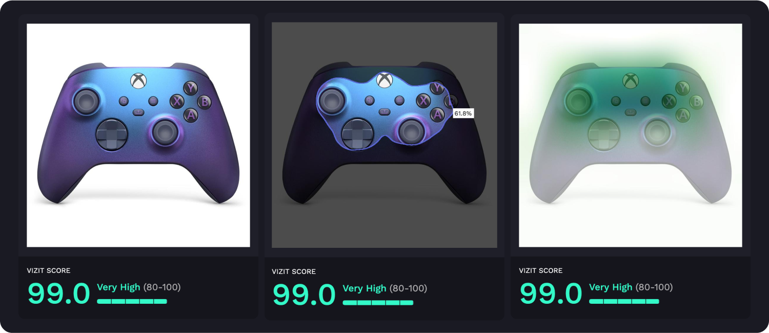 AI-powered visual appeal insights reveal specific aspects of imagery that are appealing and unappealing to a selected audience, while attention insights simulate human eye tracking and indicate where attention is likely to be garnered and how the average consumer is likely to view the elements within an image. Along with Vizit Scores, these insights are leveraged to prioritize changes that increase an image’s overall effectiveness with the intended audience.