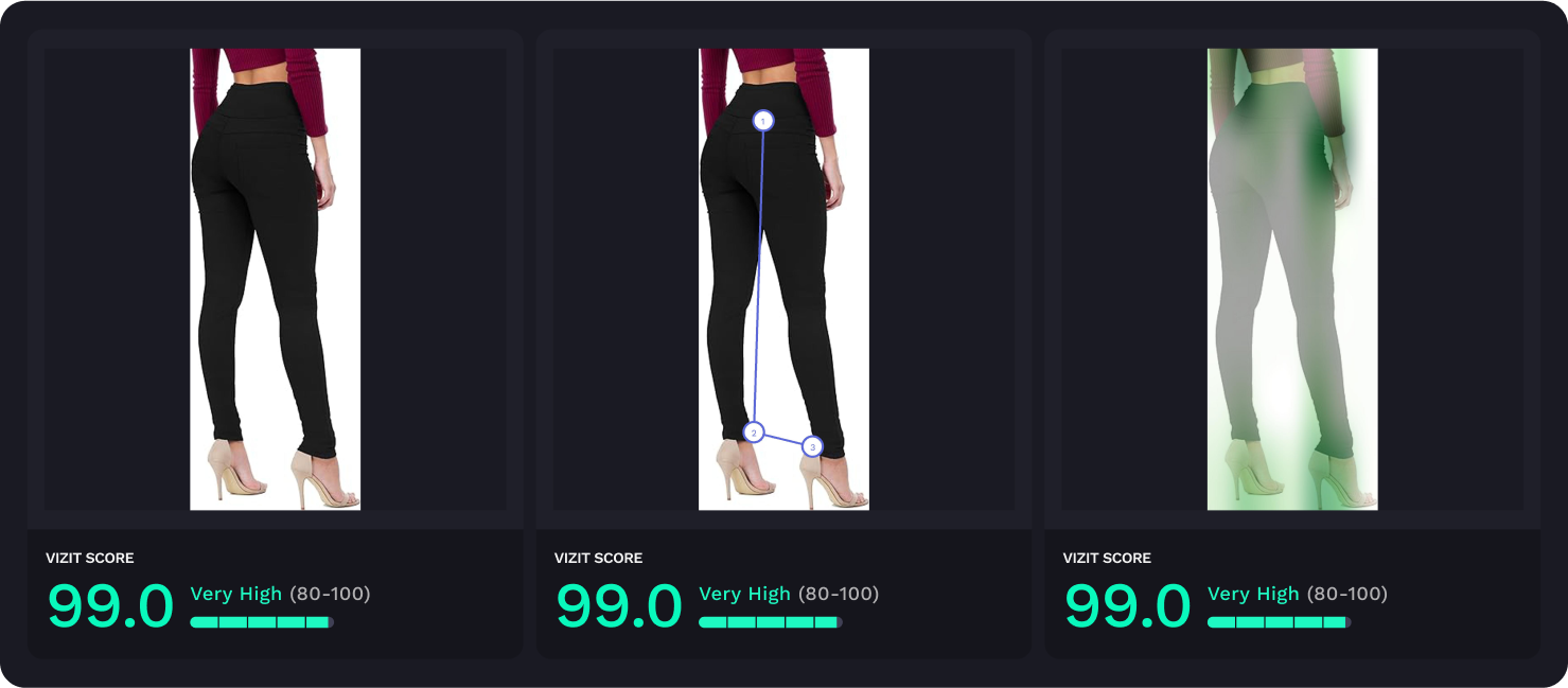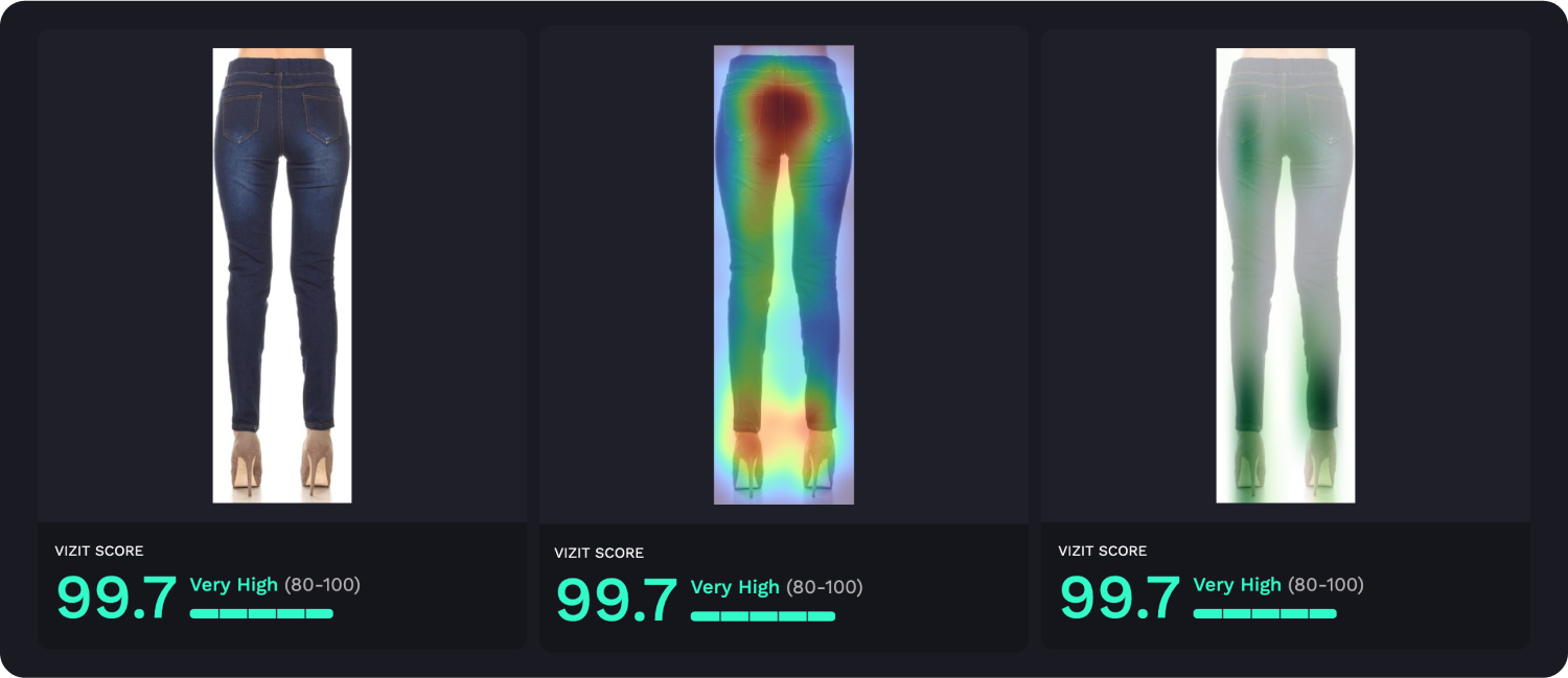 AI-powered visual appeal insights reveal specific aspects of imagery that are appealing and unappealing to a selected audience, while attention insights simulate human eye tracking and indicate where attention is likely to be garnered and how the average consumer is likely to view the elements within an image. Along with Vizit Scores, these insights are leveraged to prioritize changes that increase an image’s overall effectiveness with the intended audience.