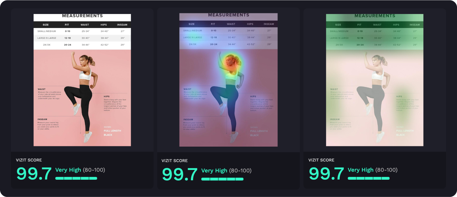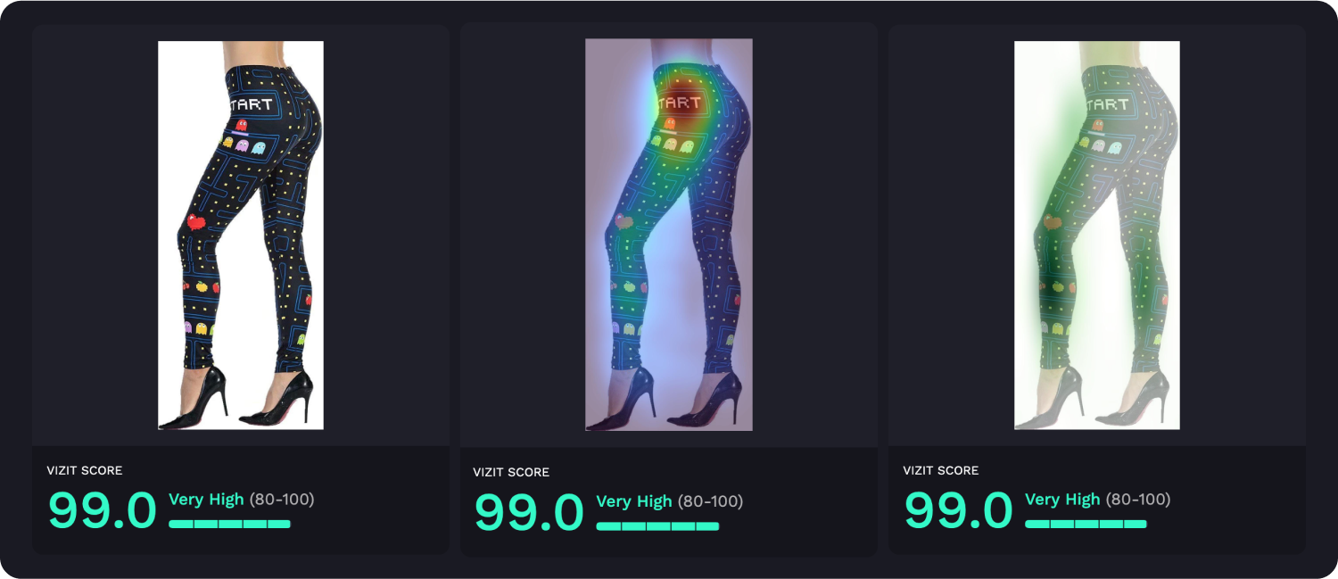AI-powered visual appeal insights reveal specific aspects of imagery that are appealing and unappealing to a selected audience, while attention insights simulate human eye tracking and indicate where attention is likely to be garnered and how the average consumer is likely to view the elements within an image. Along with Vizit Scores, these insights are leveraged to prioritize changes that increase an image’s overall effectiveness with the intended audience.