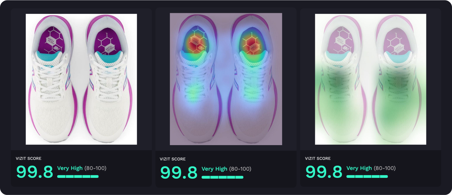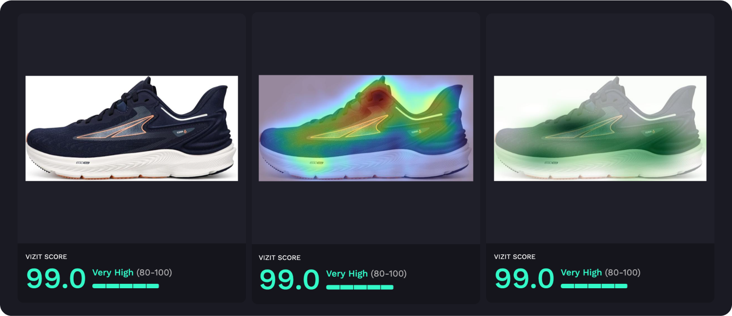 AI-powered visual appeal insights reveal specific aspects of imagery that are appealing and unappealing to a selected audience, while attention insights simulate human eye tracking and indicate where attention is likely to be garnered and how the average consumer is likely to view the elements within an image. Along with Vizit Scores, these insights are leveraged to prioritize changes that increase an image’s overall effectiveness with the intended audience.